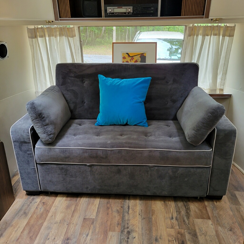 1971 Vintage Airstream Recreational Vehicle, complete with kitchen, bathroom with shower, smart TV and WIFI. This unit also includes a gas grill, firepit and deck with private hot tub. The ARLO Airstream sleeps up to 4 guests with 2 twin beds and a pull-out sofa bed.